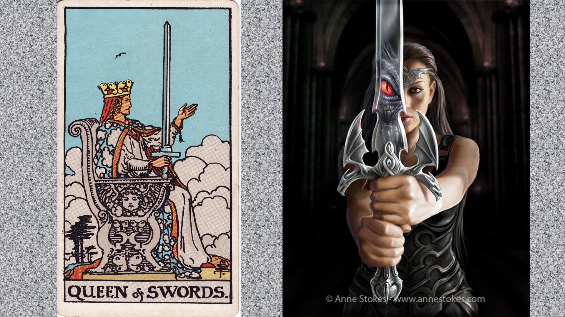 I thought it would be interesting to place two similar images together and let them stimulate my imagination. On the left is the Queen of Swords, from the Rider-Smith-Waite tarot deck. Illustration by Pamela Colman Smith. The right picture is by fantasy artist Anne Stokes.