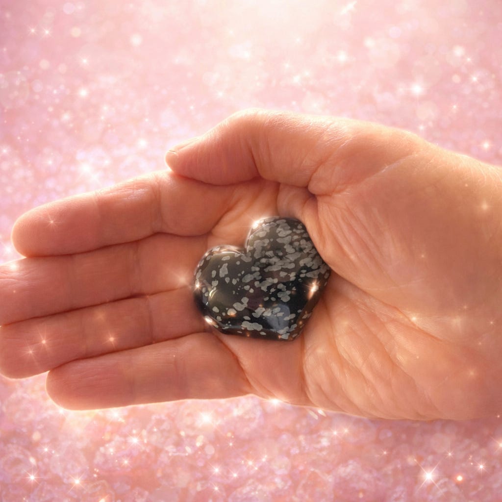 The image above has crystal work. The heart is snowflake obsidian. It can be used to bring hidden emotions to the surface for healing and to calm stressful mental patterns. Obsidian is a hard volcanic glass, forged in the heat of the earth’s core as it comes to the surface. I appreciate its strength, and the flecks of light in the dark. The background is rose quartz. This popular pink stone is known as the “stone of unconditional love,” and is used to promote self-compassion, inner peace, and emotional healing. Its pretty pink color is so soothing. I appreciate its gentleness.